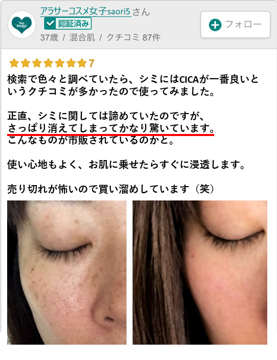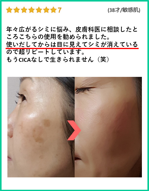 母は結構濃いシミがあったので3週間くらいかかっていましたが、 完全に跡形もなくなっています。 凄すぎるぞ薬用CICAクリーム! >>薬用CICAクリームの公式サイトはこちら テンションが上がってCICAクリームの評判を調べていると 出るわ出るわシミ消え報告。 若返りの嵐です。